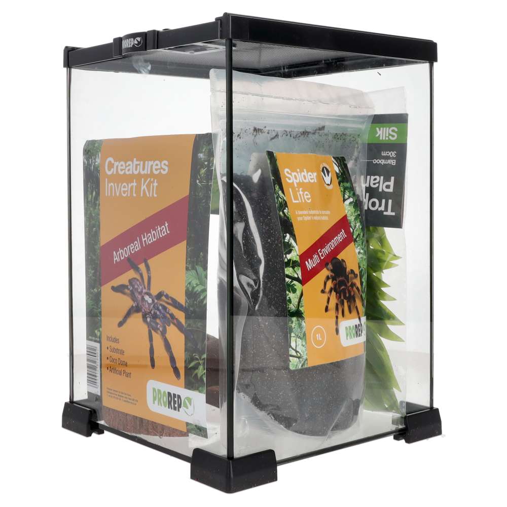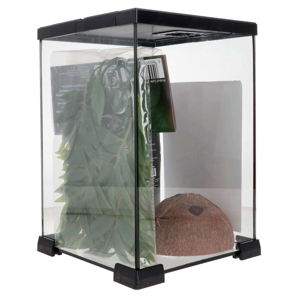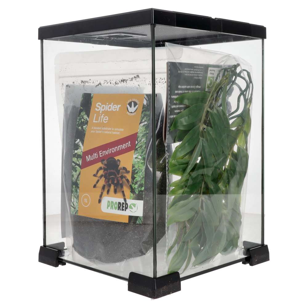 The kit includes ProRep Spider Life substrate, formulated for moisture retention and burrowing, along with a Coco Cave to provide a safe, natural hiding place. A silk hanging plant adds climbing opportunities and visual cover, helping arboreal species feel secure. The mini glass terrarium (200 × 200 × 300mm) features a sliding mesh lid for excellent ventilation and escape‑proof security, making it suitable for both new and experienced invertebrate keepers.